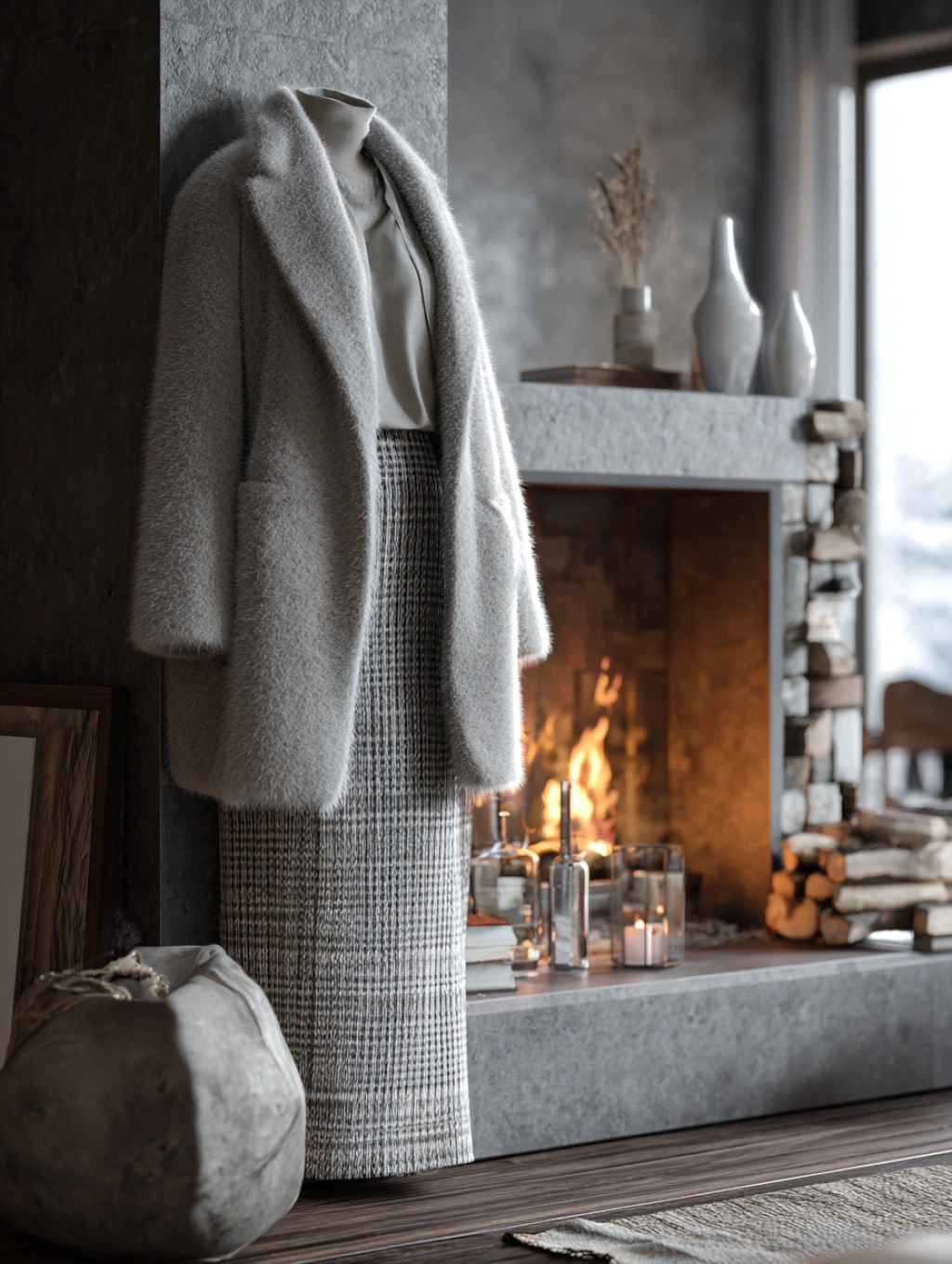 提示词(Prompt) 冬季室内聚会,女士羊羔绒外套与灰色针织裙,米白与灰色调,温柔休闲风格,外套绒毛细腻,壁炉火光下衣物温暖,服饰设计效果图 --ar 3:4 |