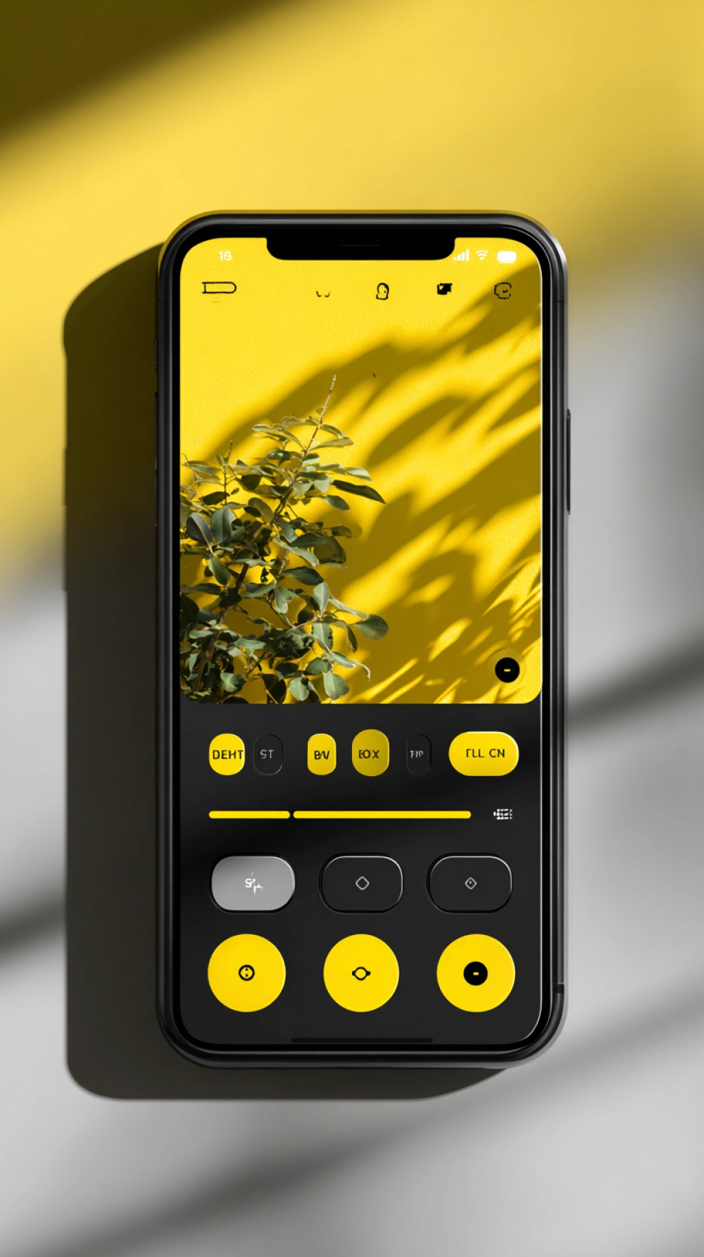 提示词(Prompt) 手机拍照应用UI,取景框与滤镜选择条,黑色与亮黄点缀,简约时尚风格,按钮有立体高光,屏幕反射自然光线,界面直观易操作 --ar 9:16 |