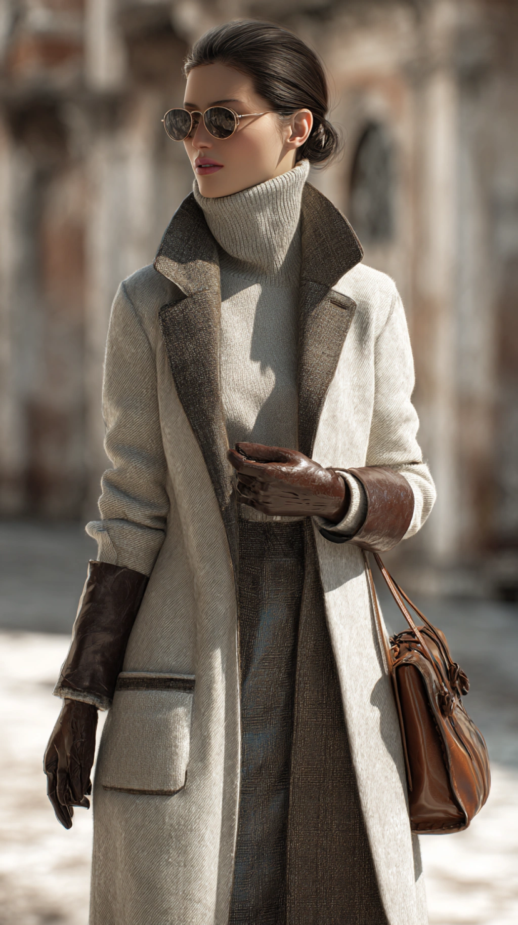 提示词(Prompt) 冬季商务出行,女士羊毛大衣配高领毛衣与皮质手套,米白与深棕色调,简约都市风格,大衣轮廓挺括,冷冽晨光下质地厚重,服饰设计效果图 --ar 9:16 |