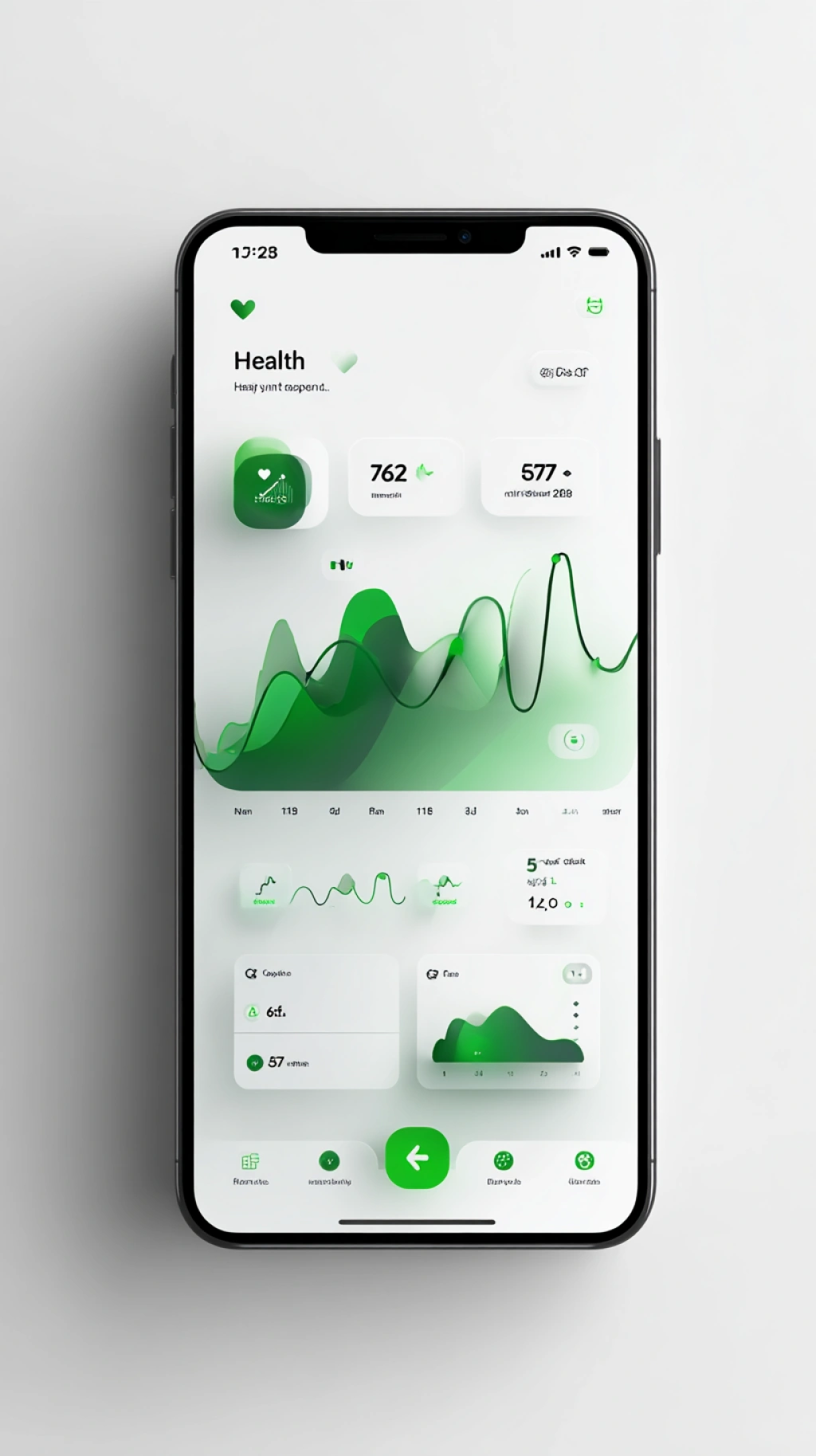 提示词(Prompt) 手机健康应用UI,心率曲线与步数统计,绿色与浅灰色调,清新健康风格,图表细节丰富,底部导航有柔光渐变,界面温暖舒适 --ar 9:16 |